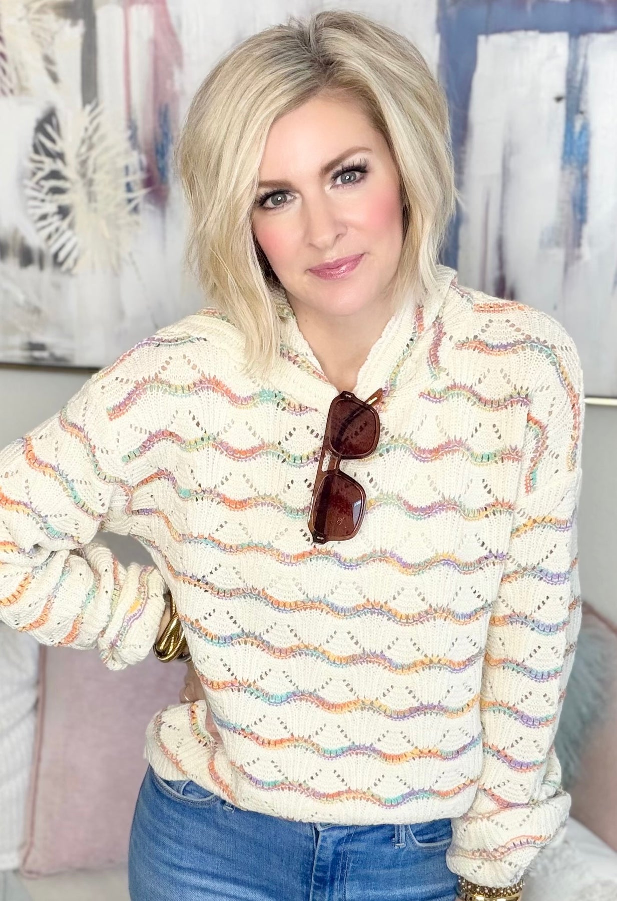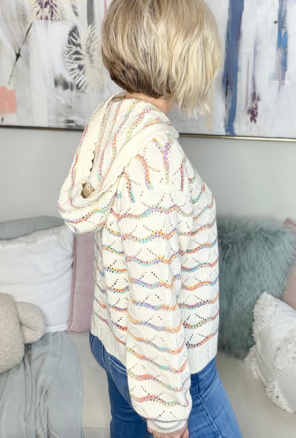 Cool nights & casual days call for our candy wave sweater with hoodie! Pair it with your favorite denim cut-offs & sandals for an easy, throw on & go outfit that’s cute & put together while saving you time getting out the door. It’s drop shoulder & relaxed band let it hang perfectly for pure comfort. Not to mention the added detail with scallop trim on the hood!