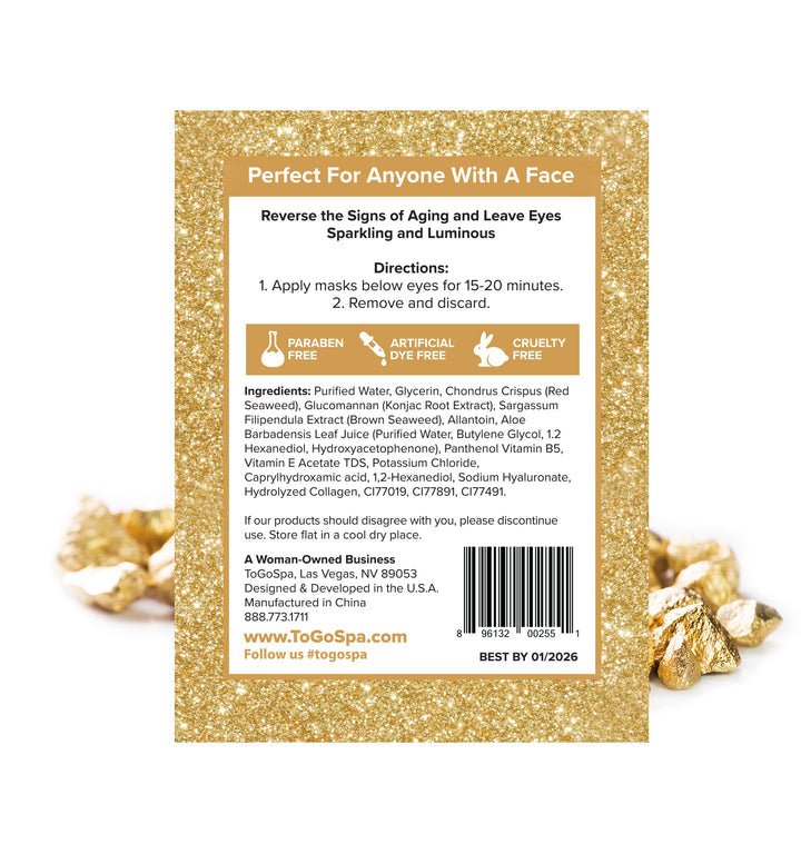 Micro-Infused Collagen Gel Masks with Marine Plant Collagen, Hyaluronic Acid, Aloe Vera, Vitamins C & E, Amino Acids and 24K Nano Gold to reverse the signs of aging and leave eyes luminous.
