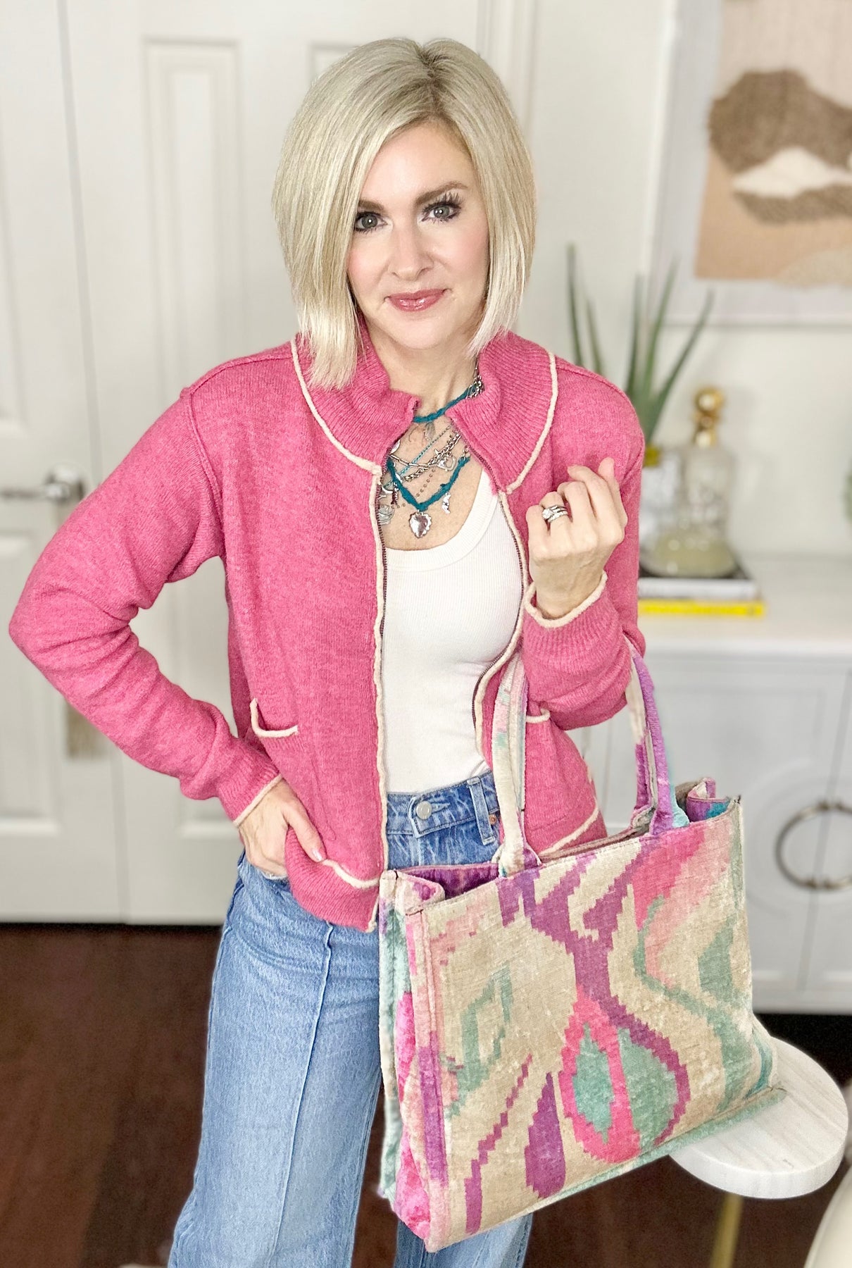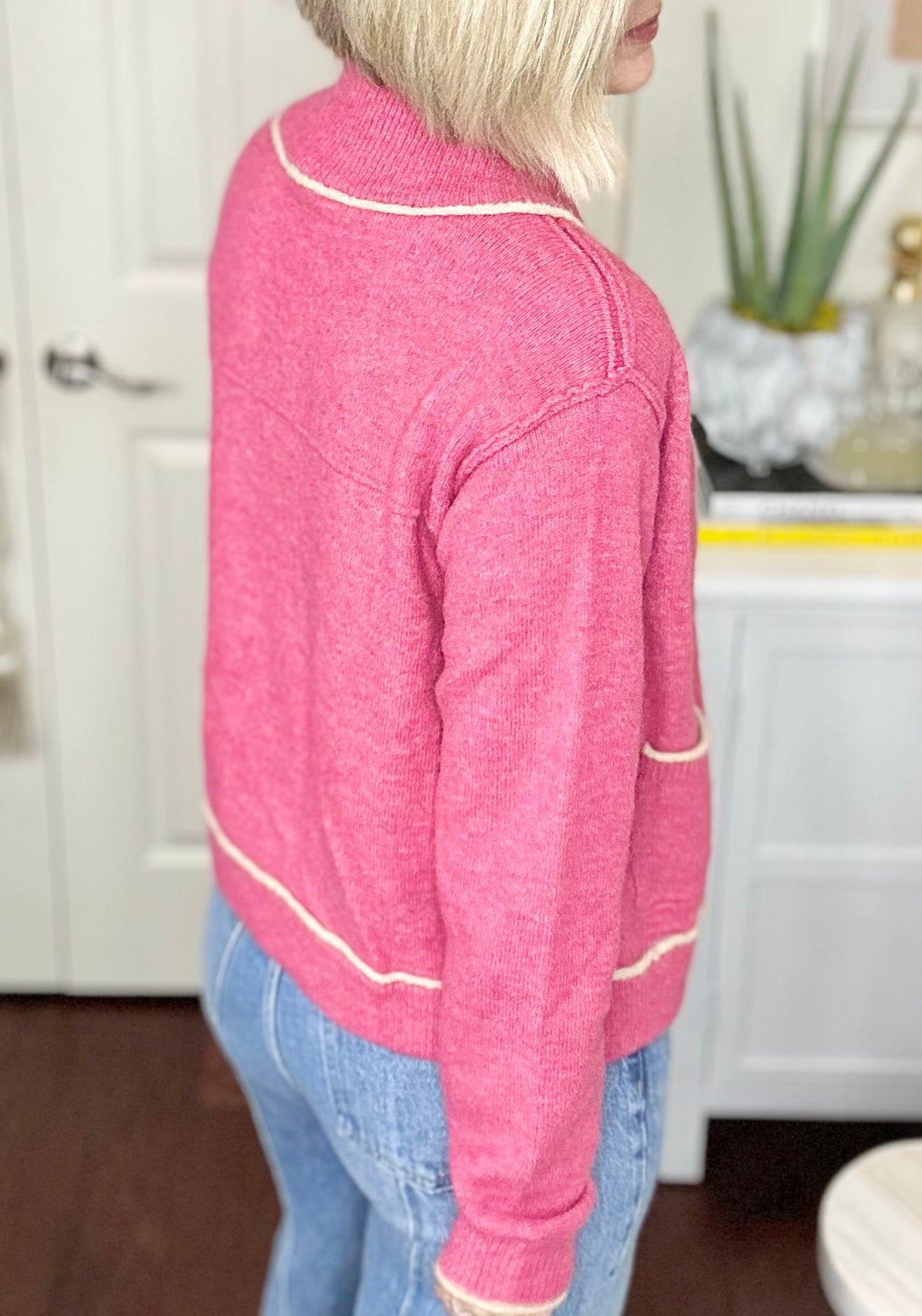A store favorite, this lightweight sweater has great versatility that's subtle & functional! Pair with a go-to basic, or layer with a graphic tee for a fun spin on this closet staple. This is the type and style of sweater you'll have for years to come, she's that simple & good! The perfect pinky, rose hue with ivory piped trim details, girlfriend she's an easy Add-to-Cart piece!