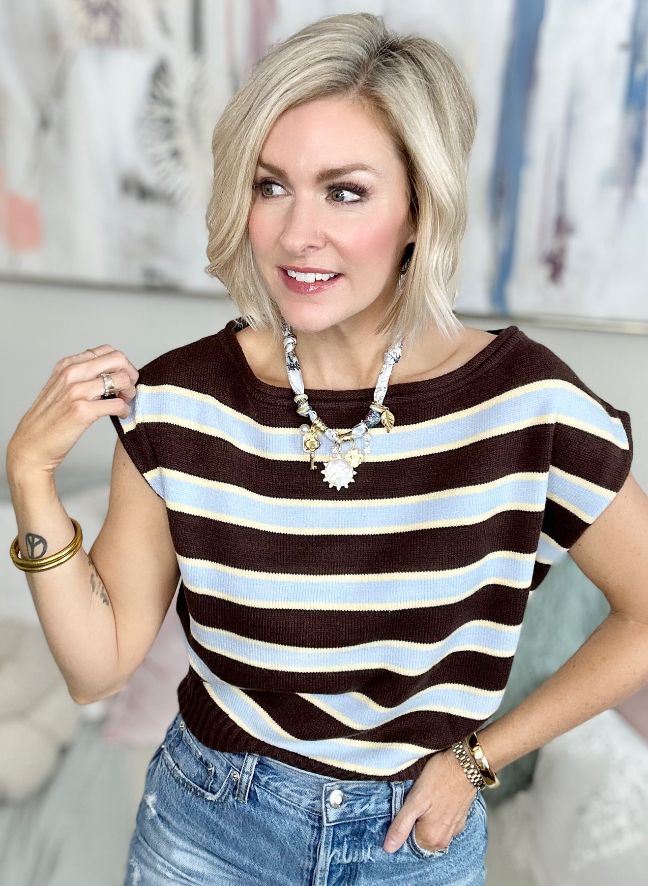 The softest boatneck you’ll ever put on! Chocolate, yellow & baby blue stripes make this the perfect Winter/Spring transition piece. Tuck it in or wear it out, it’s buttery soft, knit material has great stretch so it bends & flexes with you through every move.